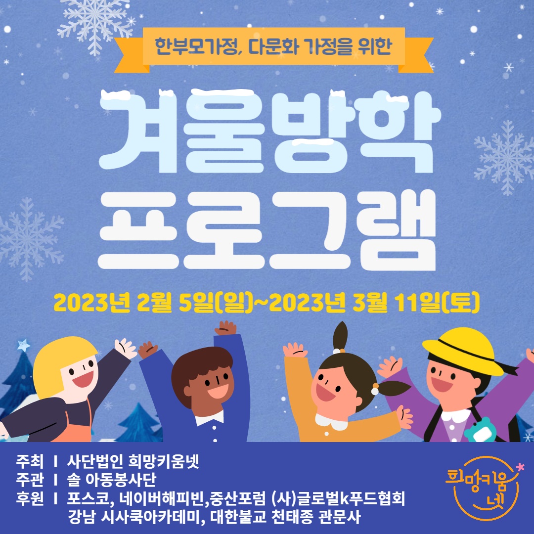 2022.12.01부터 2023.01.14까지, 희망키움넷 결연가정 아이들의 겨울방학 창의체험 프로그램 운영비 마련을 위한 네이버 해피빈 모금함은 포스코1%나눔재단 마이리틀채리티 기업 후원금을 포함, 32분의 후원자님의 마음으로 총 5,527,700원이 모금되었습니다. 아동청소년의 보람있는 겨울방학을 위해 관심가져주시고 함께해주신 후원자님들께 감사드립니다.