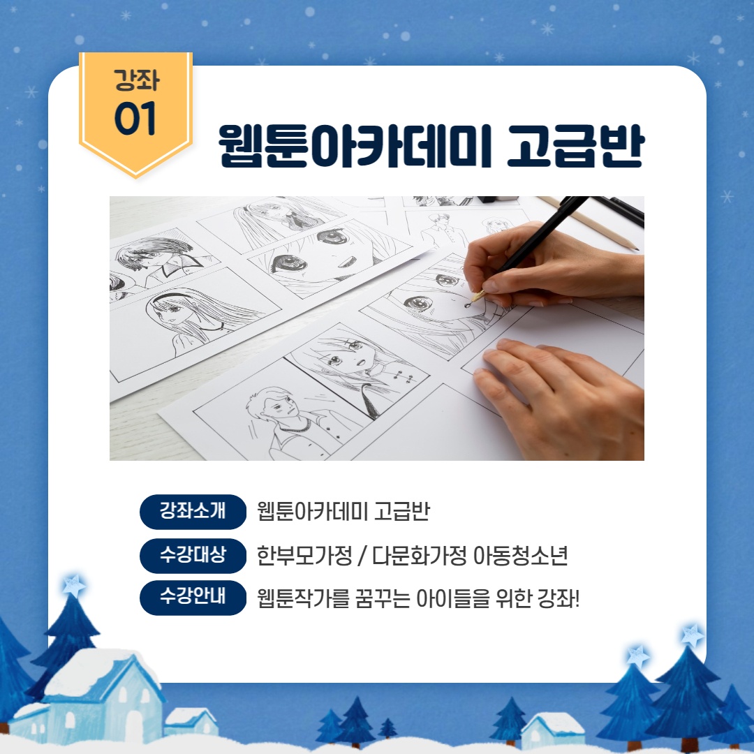 첫번째, 웹툰아카데미 고급반입니다. 초급반, 중급반을 거쳐 이번에 고급반이 진행되는데요, 프로그램 종결식에 참여아동들의 작은 작품전시회도 열릴 예정이랍니다.