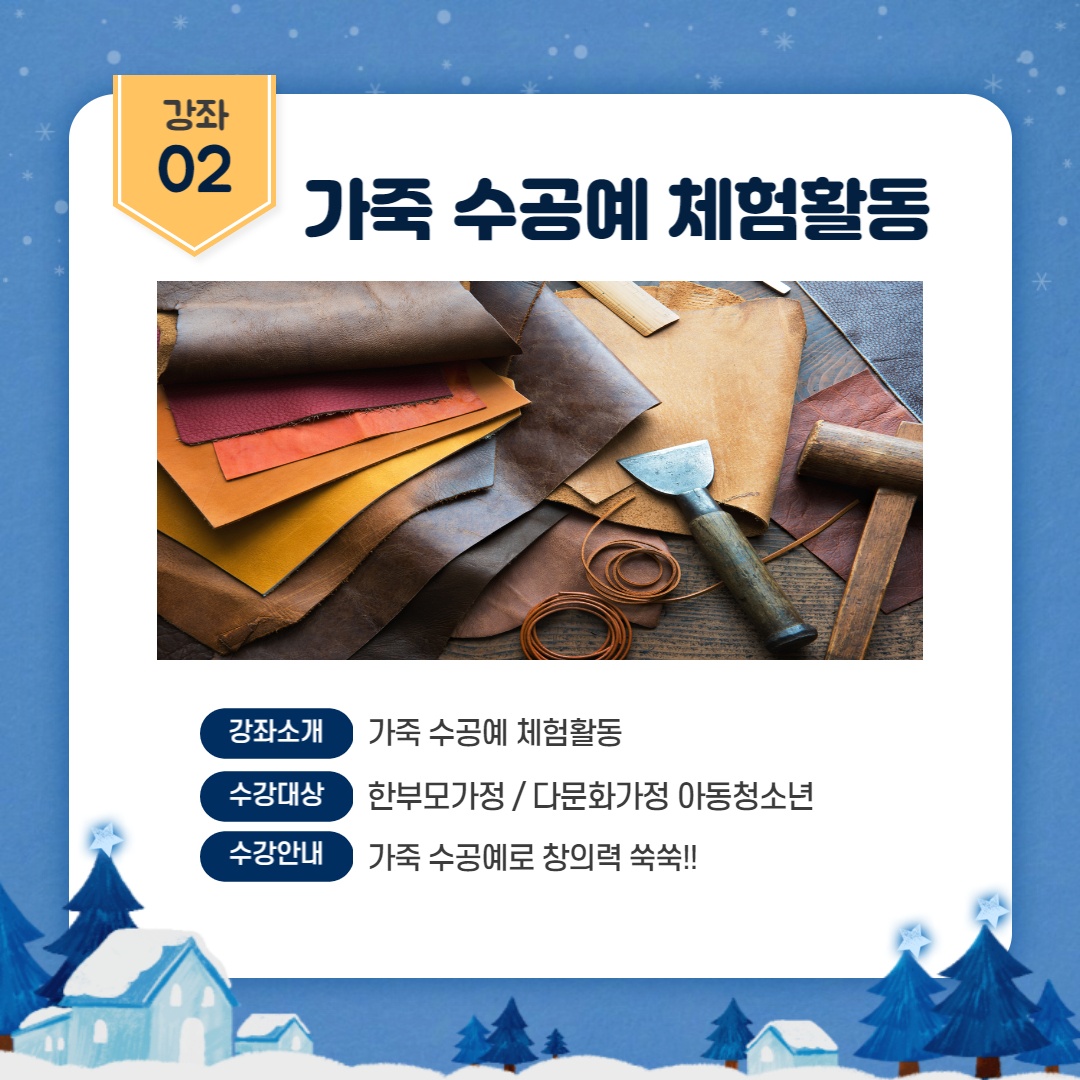 두번째, 가죽 수공예 체험입니다. 희망키움넷 사무실에서 3회 진행되고, 수업 마지막날인 4회차에는 직접 아이들이 가죽공방에 방문하여 아이들만의 가죽공예 물품을 만들 예정입니다.