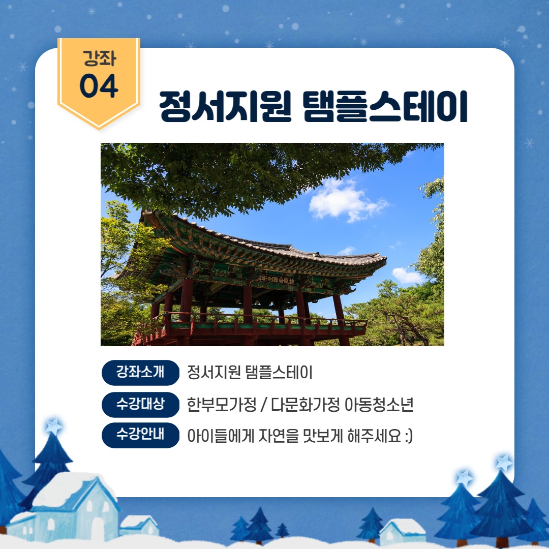 네번째, 템플스테이입니다. 지켜츄 등 유튜브에서 핫한 템플스테이는 도심 속에서 살아가는 현대인에게 자연을 느낄 수 있는 시간이자 한국의 전통문화를 체험하는 시간입니다.