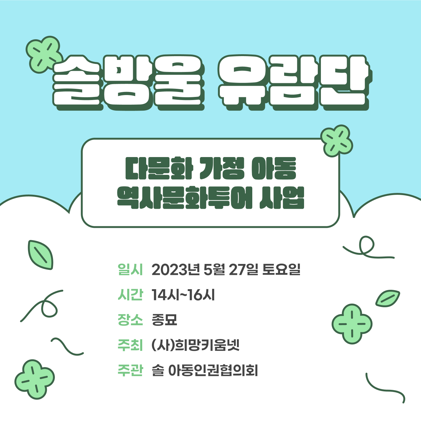 그와 관련해서 한국 역사를 잘 모르는 다문화 친구들을 위해 5월 27일 14시 종묘에서 솔 아동인권협의회와 함께하는 역사탐험 프로그램을 준비했습니다.