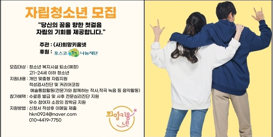 포스코 1%나눔재단과 함께하는 희망키움넷 자립준비청소년을 위한 정서 및 진로지원사업에 대해 안내드립니다.